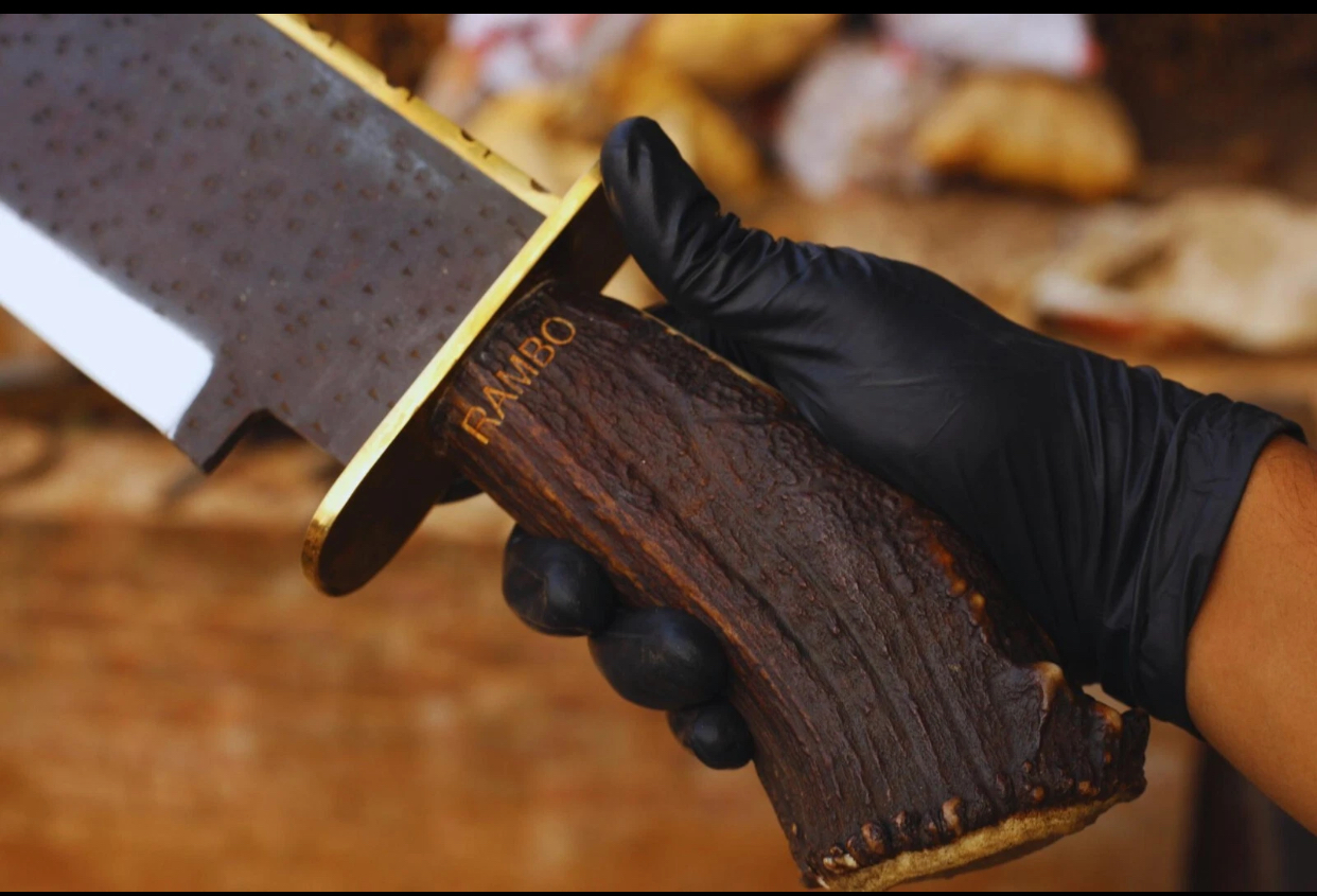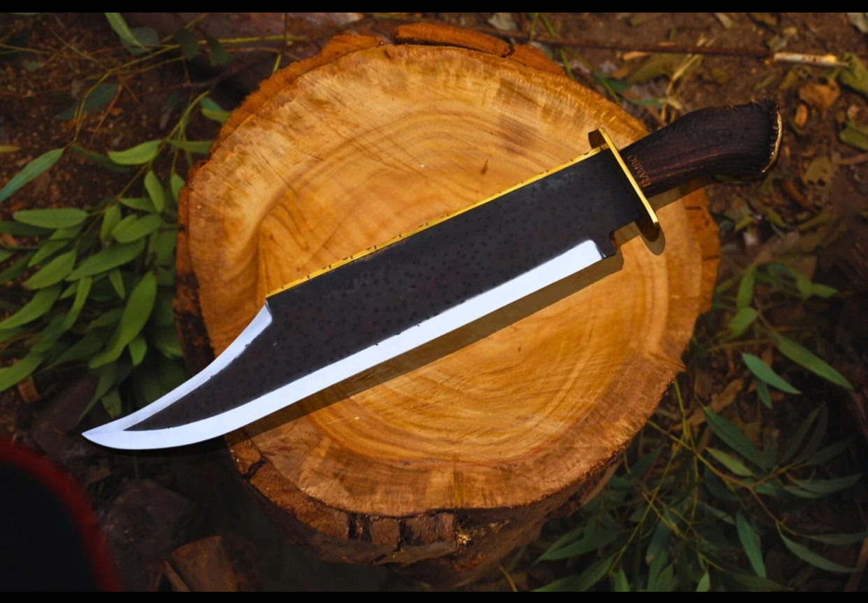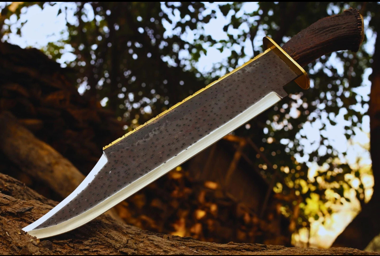 Unleash rugged craftsmanship and raw power with this Custom Handmade Rambo Bowie Knife. Forged from high-quality 1095 high carbon steel, this 26-inch knife is not just for show—it’s a beast built for performance, collection, or gifting. The natural antler stag horn handle offers a secure grip with a wild, timeless aesthetic that makes each knife uniquely one-of-a-kind.